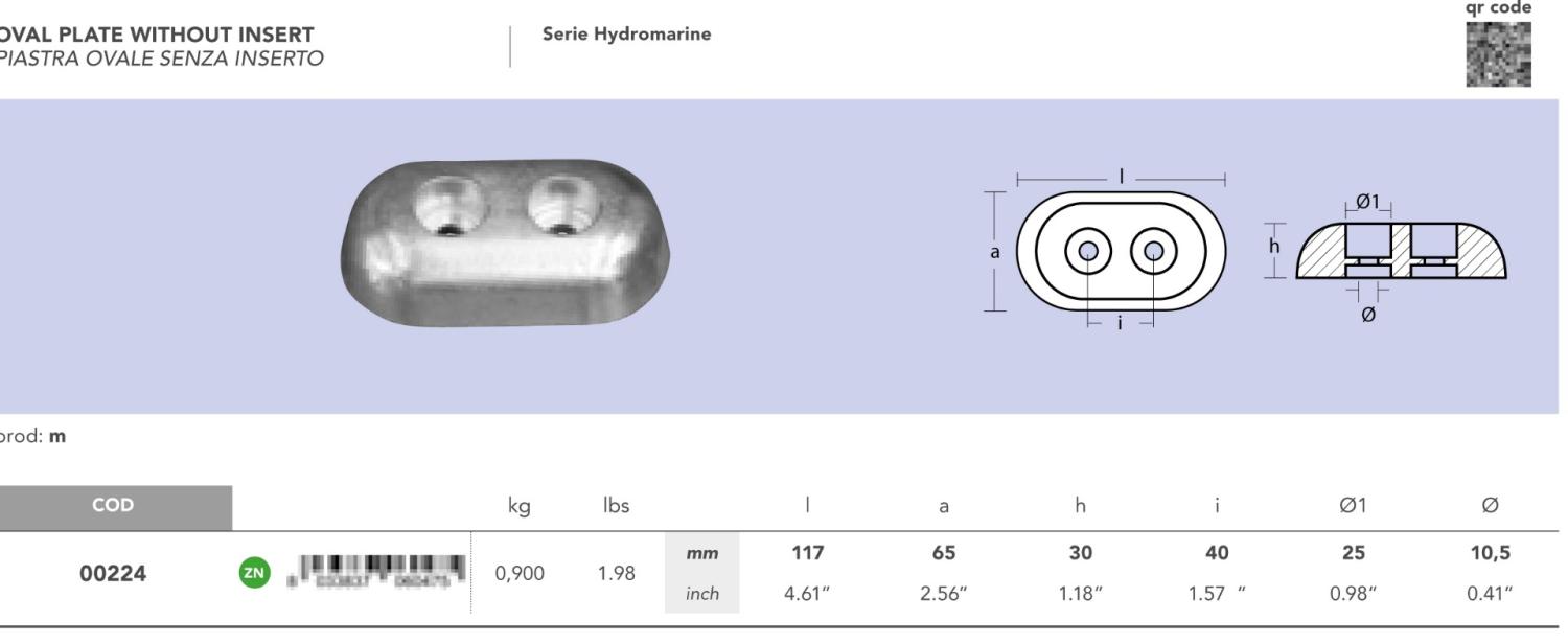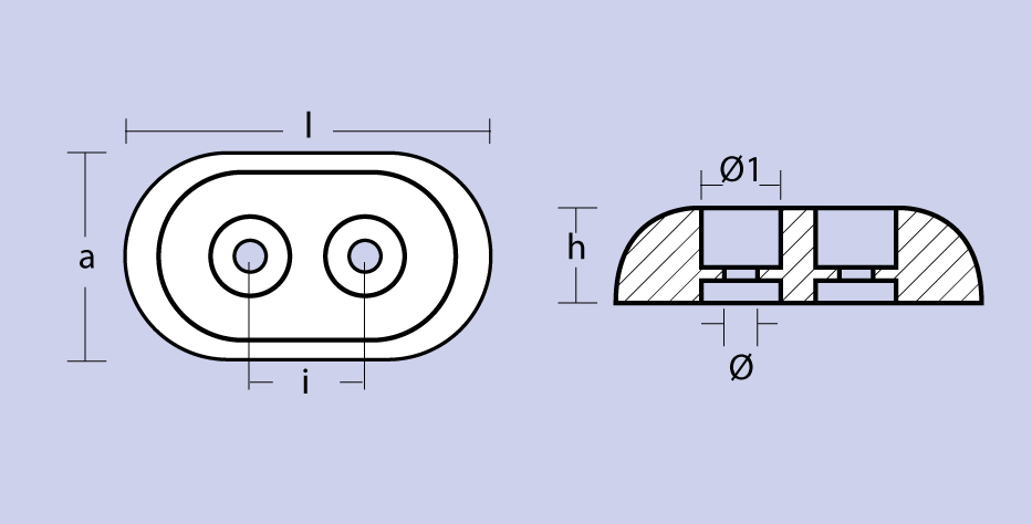 <p>Zinkanod som är oval med cc-mått på 40mm</p><p>Serie Hydromarine</p><p>Mått nedan i mm</p> <p>I: 117</p> <p>a: 65</p> <p>h: 30</p> <p>i: 40</p> <p>Ø1: 25</p> <p>Ø: 10,5</p> <p>Vikt (kg): 0,990</p>