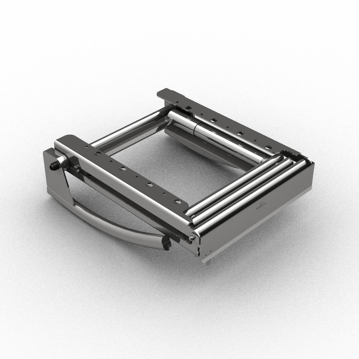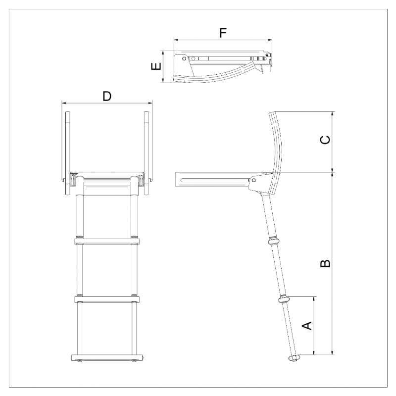 En badstege i högglanspolerat AISI316L rostfritt stål med handtag som fälls upp när man drar ut stegen som ligger i en i kassett. För montering under badbrygga med ovala steg som har dräneringshål Stegen har också ett låssäkerhetslock som säkerställer att det inte kan åka ut under färd.