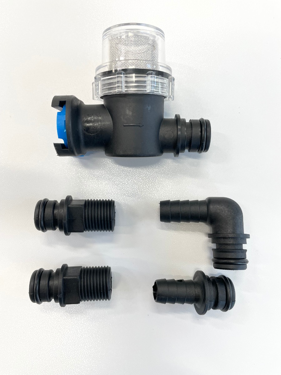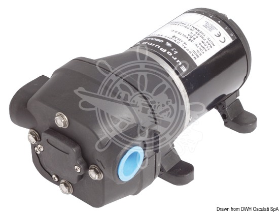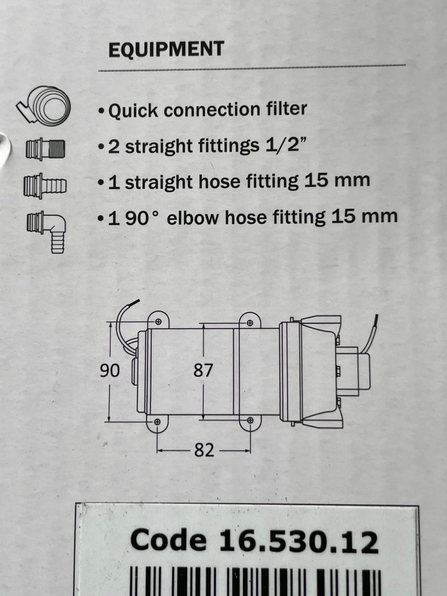 Minimal strömförbrukning 1,2A vid 12V. Självsugande för 2m. Filter och anslutningar medföljer. Pumpen passar till kompressor W 35F (art. 0204710).