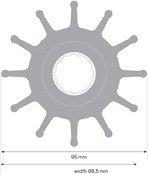 <p>IMPELLER 09-814B för pump modell F9 </p><p>A Diameter: 95mm.</p><p>B Djup: 88,5mm.</p> <p>C Axelmått: 24mm.</p> <p>Axeltyp: Splines.</p> <p>Antal vingar: 12st.</p> <p>Material: Neoprene (enbart för vatten).</p> <p>Lockpackning ingår ej.</p> <p></p> <h3><strong>Ersätter Jabsco Impeller 17936-0001, 21676-0001</strong></h3> <h3><strong>Volvo Penta 875814, 875697, 845796, 844683, 842857, 875814-6</strong></h3> <h3><strong></strong><strong style="font-size: 12px;">Yanmar Impeller </strong><strong style="font-size: 12px;">165000-35270 (Engine 6SY-STP 8SY-STP)</strong></h3> <h3><strong>Används på Scania DS14, DSI11, DSI14,DN11, DI13, DI 16</strong></h3> <p><strong>Ersätter Scania Impeller 323897; Scania 323897-9 / 2295719</strong></p> <h3><strong>Används på MAN D2848 With Jabsco pump</strong></h3> <p><strong>Ersätter </strong></p> <p><strong>MAN 50.06506-0073, MAN 50.06599-6027 K used on MAN R6-800/ V8-900</strong></p> <p><strong></strong><strong> Man 50.06506.0089 50.06506-0089</strong></p> <p id="yui_3_17_2_1_1498085545420_385" class="product-title" data-content-field="title"><strong> Perkins Impeller 0460027</strong></p> <p><strong>Vetus t IMP00801</strong></p> <p><strong></strong><strong>Detroit Diesel 5196168 5198550 8924839</strong></p>