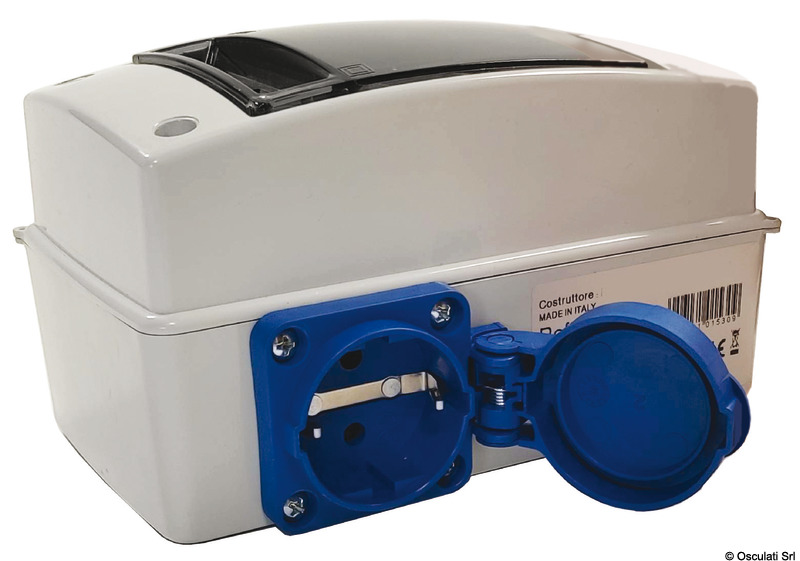Kompakt vit ABS-box med IP65 vattentät lucka, utrustad med jordfelsbrytare, strömbrytare och en 3G-kabel 3 meter lång.