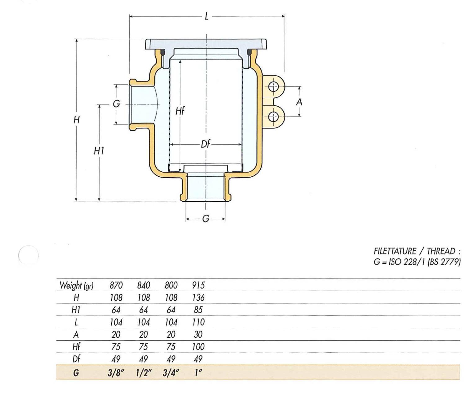 Kylvattenfilter i förnicklad mässing med plexiglaslock. Rostfritt filter. Anslutningar på sida/botten.