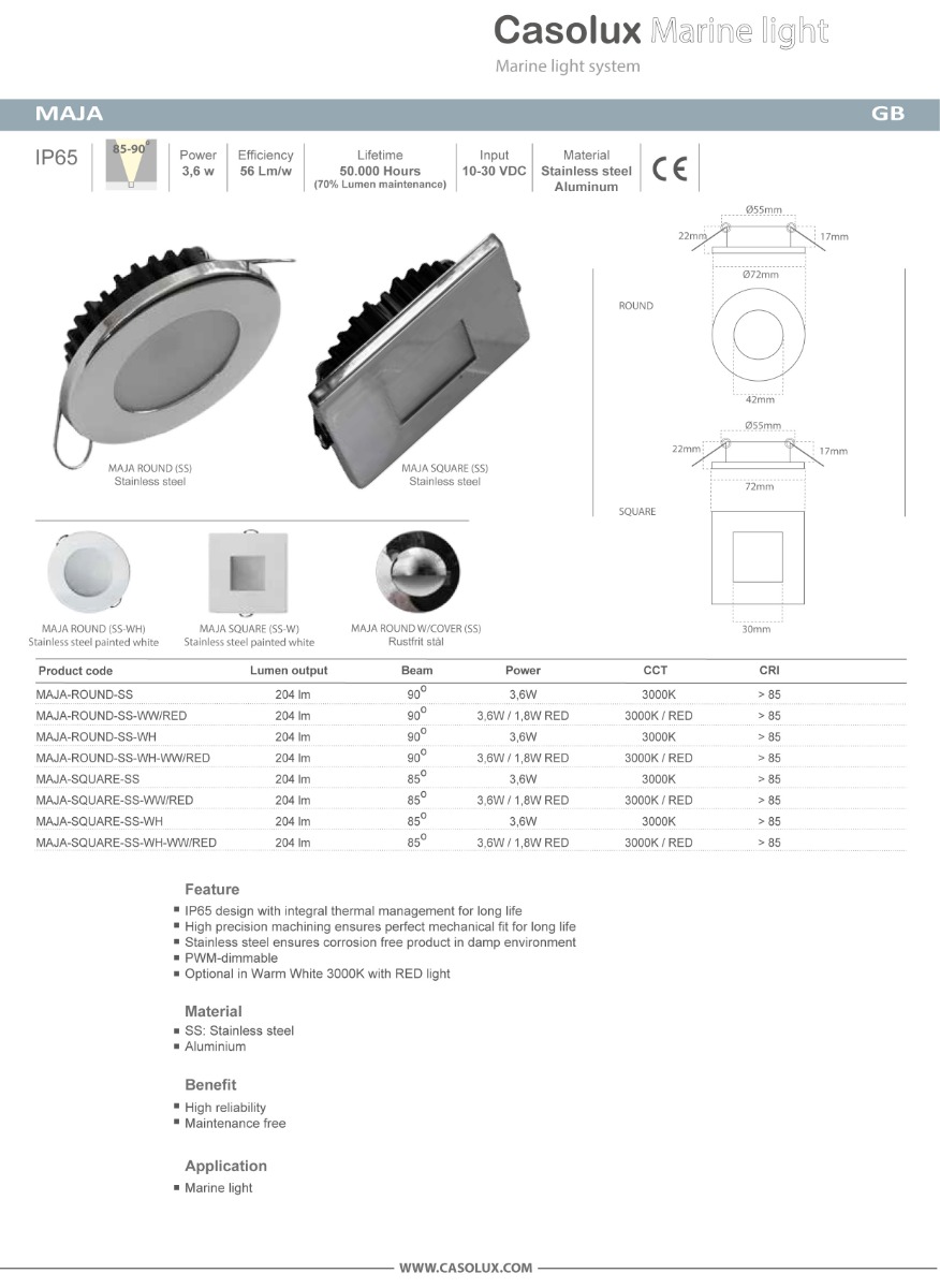 Maja Spotlight / Infällt ljus – IP65-design med inbyggd värmestyrning för lång livslängd. Hög precisionsbearbetning säkerställer perfekt mekanisk passform för lång livslängd. Anodiserad aluminium kylfläns säkerställer korrosionsfri produkt i fuktig miljö. PWM-dimbar och det röda ljuset styrs med sepparat knapp