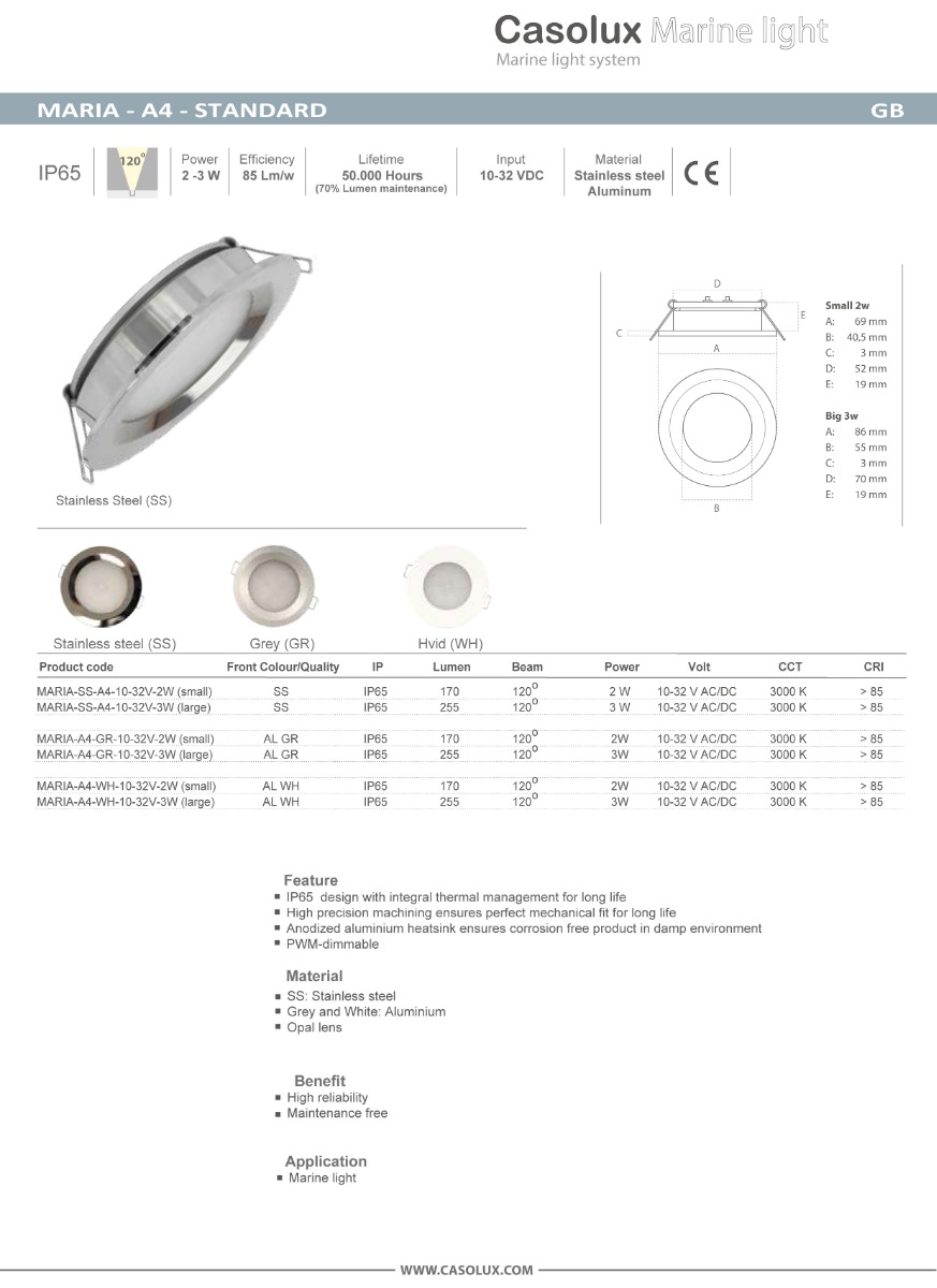 Dimbar spot från Casolux med IP65 klassning. Maria Downlight / Infällt ljus – A4 IP65-design med inbyggd värmestyrning för lång livslängd. Hög precisionsbearbetning säkerställer perfekt mekanisk passform för lång livslängd. Anodiserad aluminium kylfläns säkerställer korrosionsfri produkt i fuktig miljö. PWM-dimbar