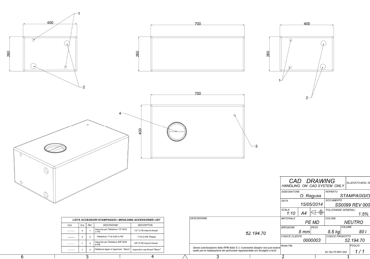 Färskvattentank i vit polypropylen med inspektionslock samt 4st blindhåls anslutningar i följande storlekar 1/2" - 1 1/4"